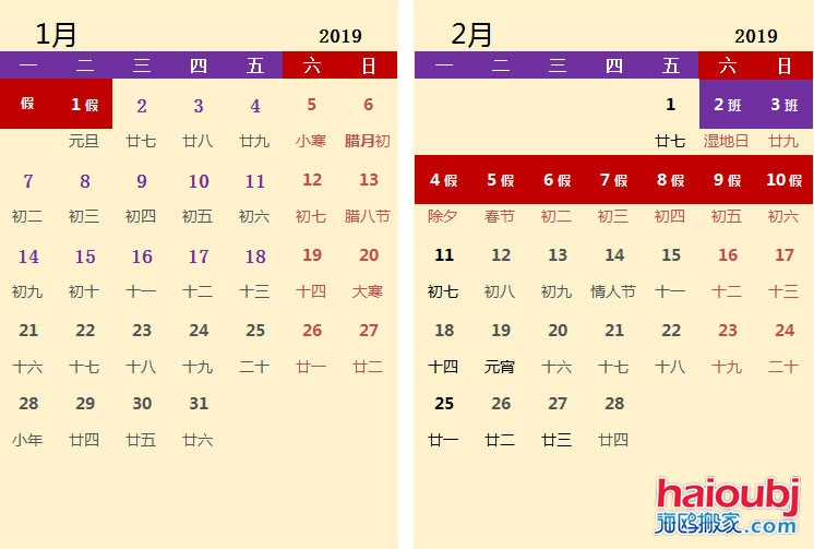 放假時(shí)間為2019年2月4日開(kāi)始到2019年2月10日,共計(jì)7天,反正每年都是這樣安排的。2月2日和2月3日分別為周六和周日,均需要正常上班。
